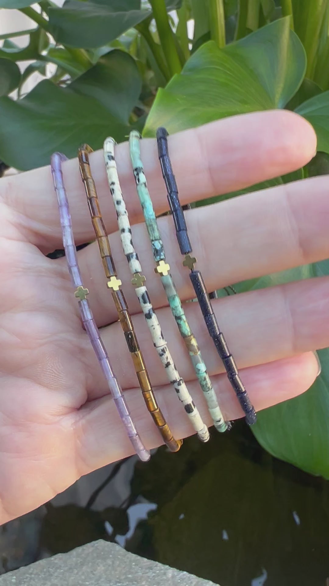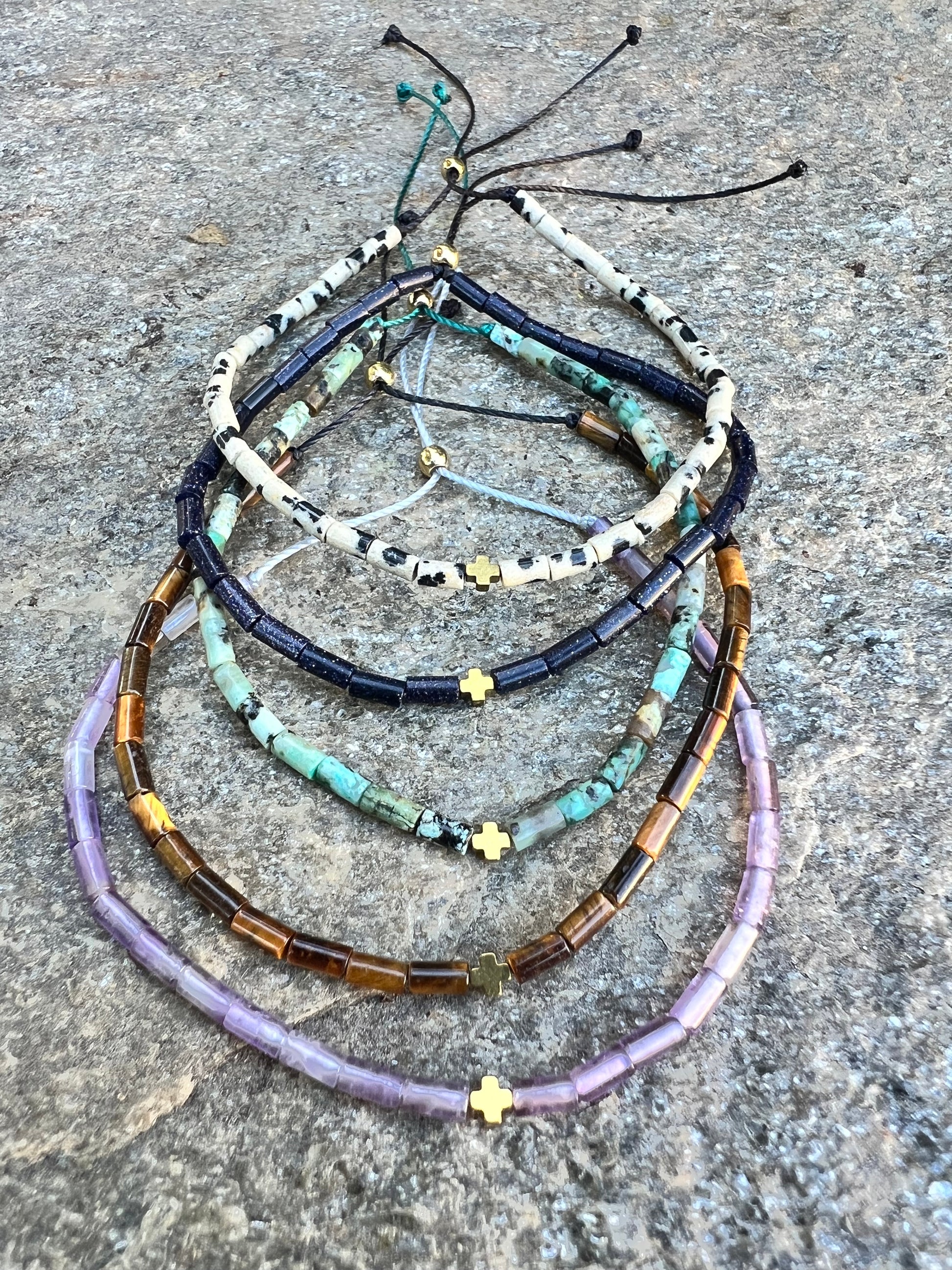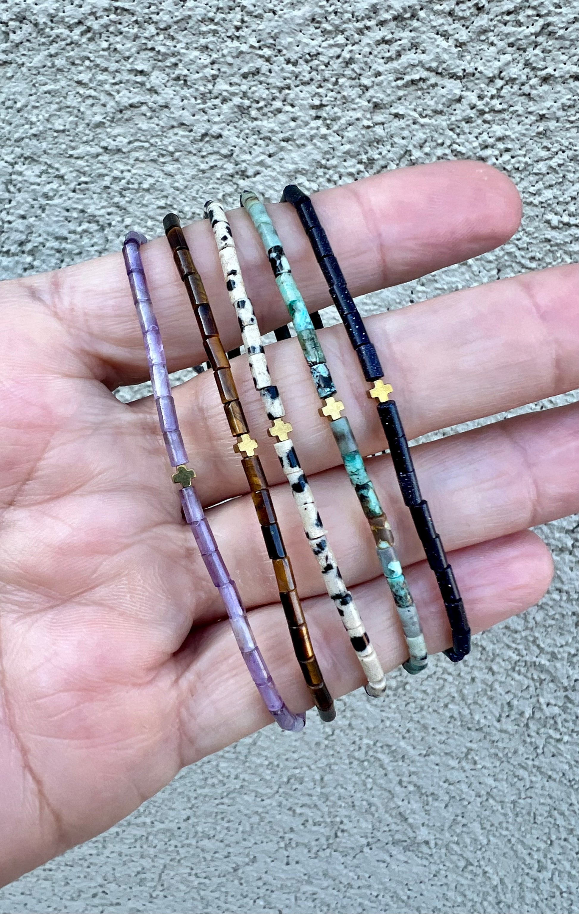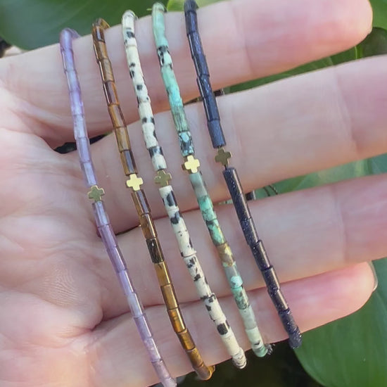 Made with 4x7mm cylinder beads and a hematite cross. This adjustable bracelet fits all wrist sizes.