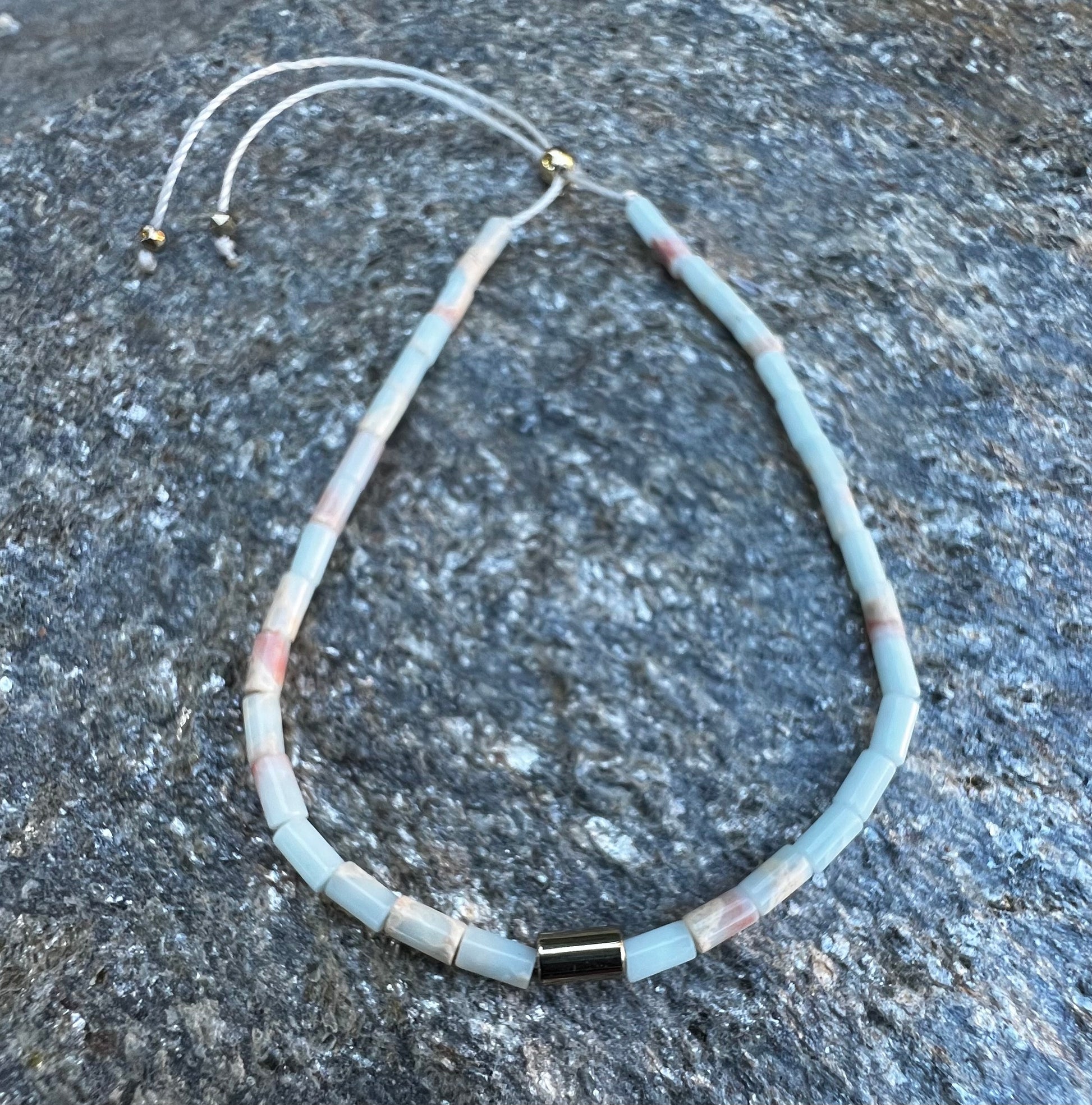 Made with 4 x 6 mm cylinder gem beads. This adjustable bracelets fits all wrists.